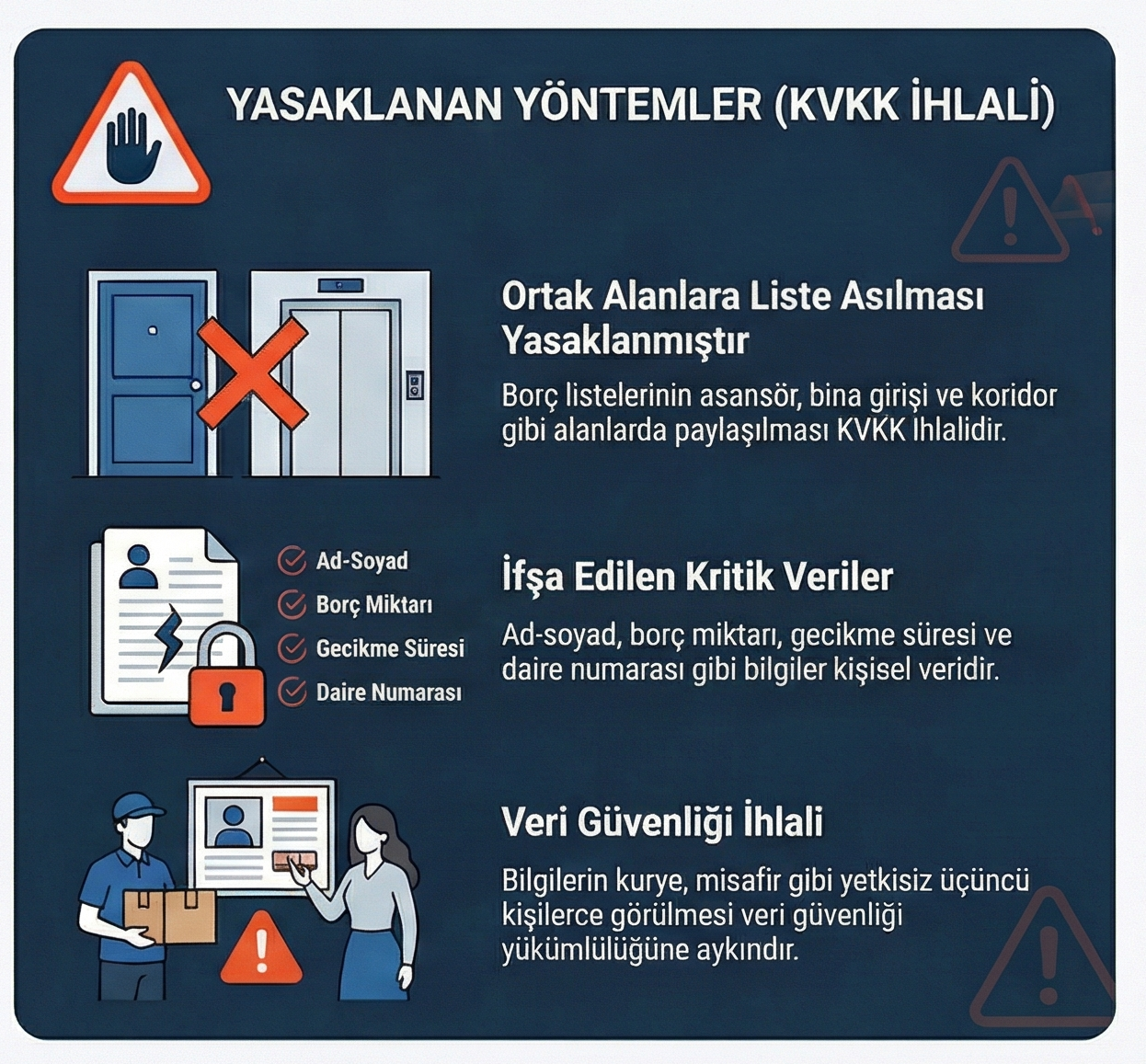 Metinde adı ve soyadı yazmasa dahi; sadece daire numarası, kat bilgisi veya blok adı ile eşleşen borç tutarı bilgisi, o dairede yaşayan kişileri belirlenebilir kıldığı için kişisel veri niteliğindedir. Bu verilerin ortak alanlarda ifşası, verilerin "işlendikleri amaçla bağlantılı, sınırlı ve ölçülü olma" ve "hukuka ve dürüstlük kurallarına uygun olma" temel ilkelerine aykırılık teşkil etmektedir. Her ne kadar 634 sayılı Kanun’un 20. ve 35. maddeleri yöneticiye alacak takibi ve gider toplama yetkisi verse de, bu yetki anayasal bir hak olan özel hayatın gizliliği ile dengelenmelidir.