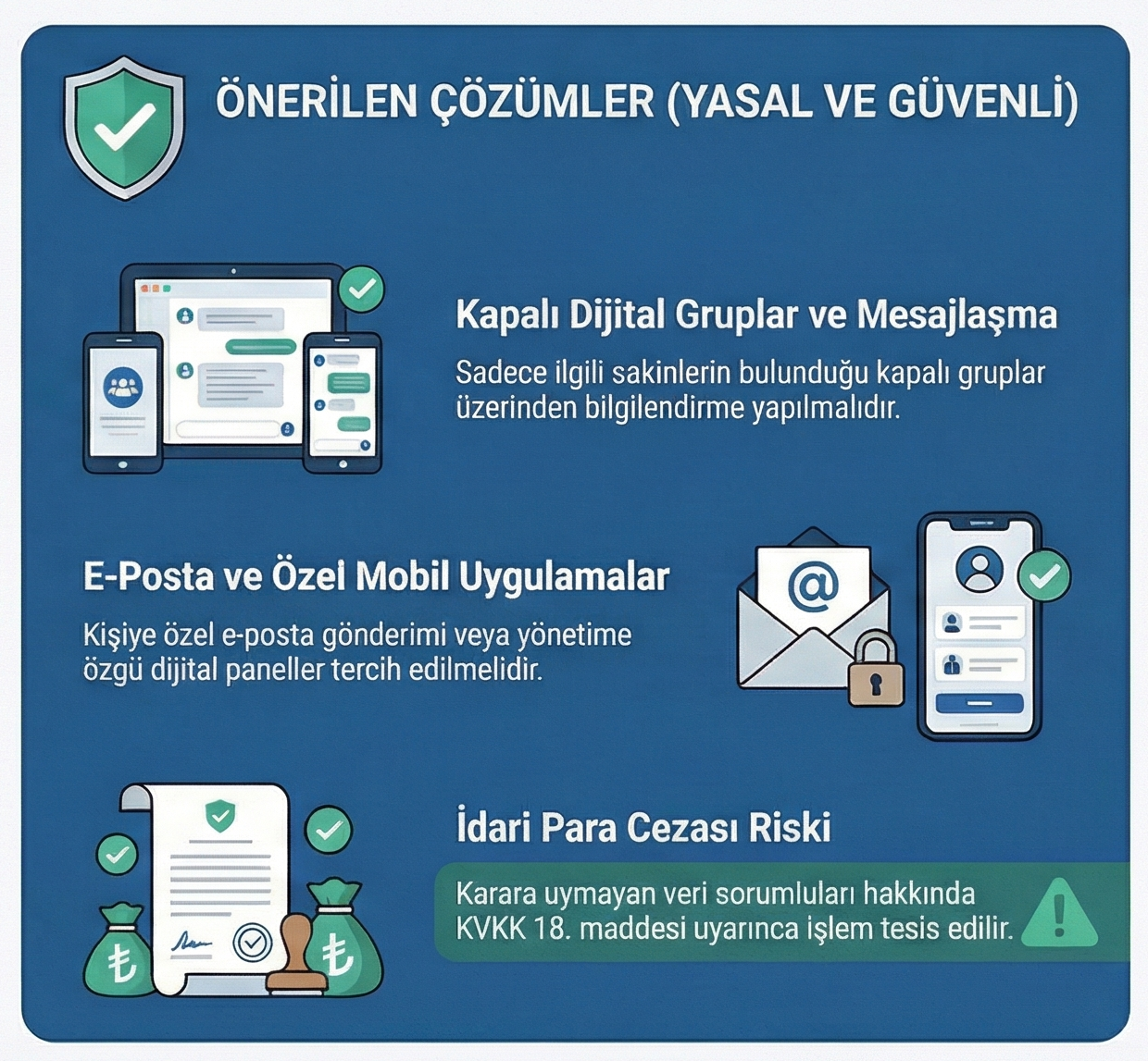 İlke kararı, 6698 sayılı Kanun uyarınca bağlayıcıdır. Kurul, kararında açıkça belirtildiği üzere, bu kurallara uyulmaması ve borç bilgilerinin ortak alanlarda ifşasının devam etmesi halinde; Veri Sorumlusu (Site/Apartman Yönetimi) hakkında Kanun'un 18. maddesi uyarınca idari para cezası uygulanacağını vurgulamıştır. Ayrıca, bu ihlallerden doğrudan zarar gören sakinlerin, yasal haklarını arama hakkı saklıdır.