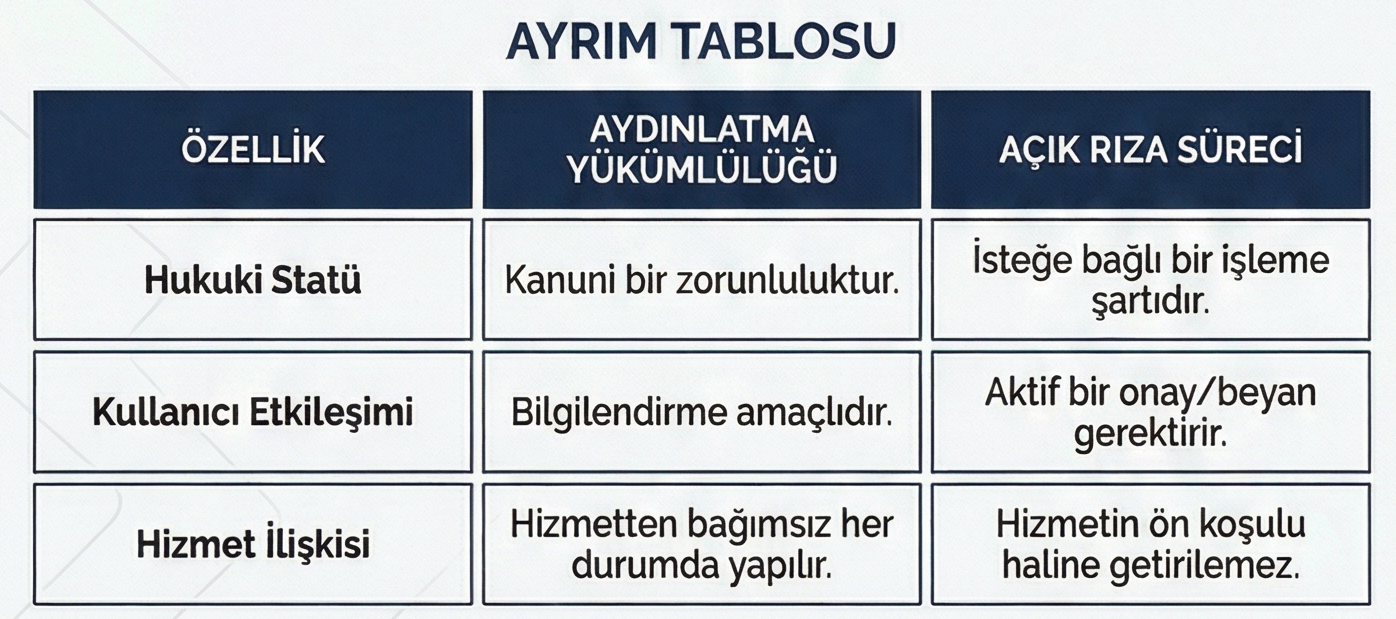· Hukuki Farklılık: Aydınlatma yükümlülüğü, Kanun'dan doğan tek taraflı bir borçken; açık rıza, verinin işlenmesi için gerekli bir rıza beyanı, kişinin özgür iradesine dayalı bir onaydır. Bu iki kavramın iç içe geçmesi, ilgili kişilerin yanıltılmasına yol açtığı için hukuka aykırı kabul edilmiştir. Bu nedenle iki metin fiziksel veya dijital olarak birbirinden tamamen ayrı sunulmalıdır.